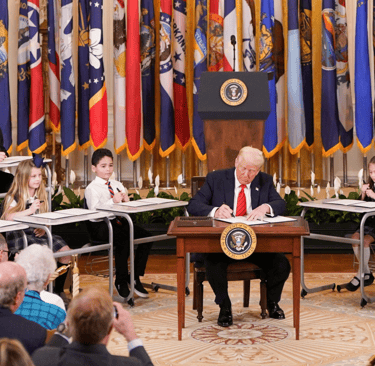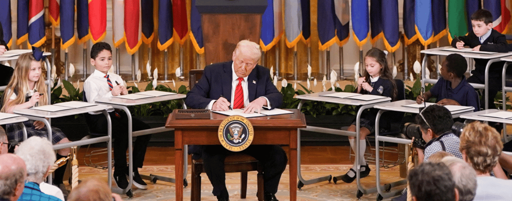 President Donald Trump signs an executive order in the East Room of the White House directing the dismantling of the U.S. Department of Education, during an event staged as a classroom with students looking on, March 2025. Official White House Photo.